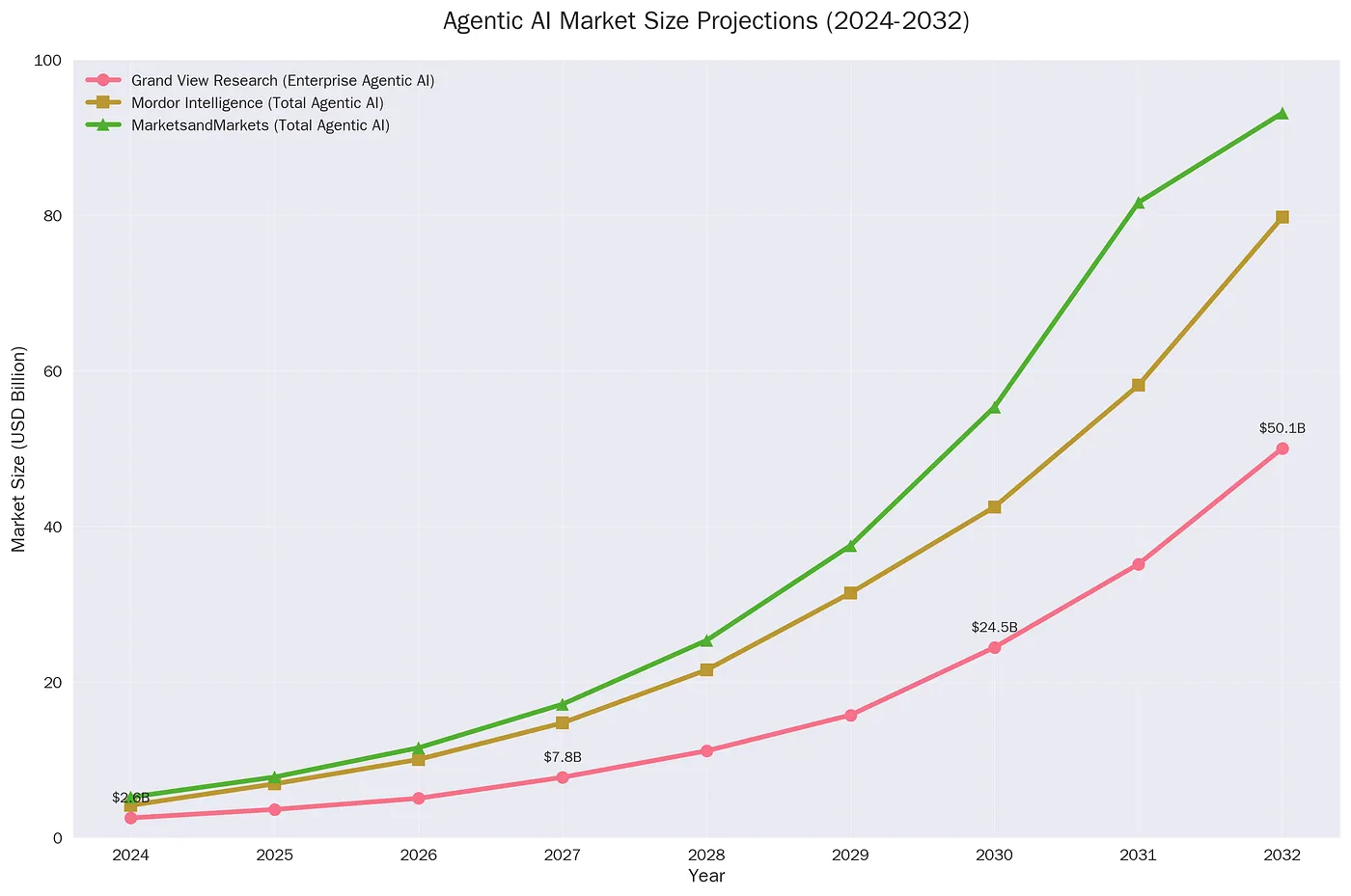 Market projections for agentic AI show a steep and consistent growth trajectory across all major analyst firms. Source: Grand View Research, Mordor Intelligence, MarketsandMarkets.